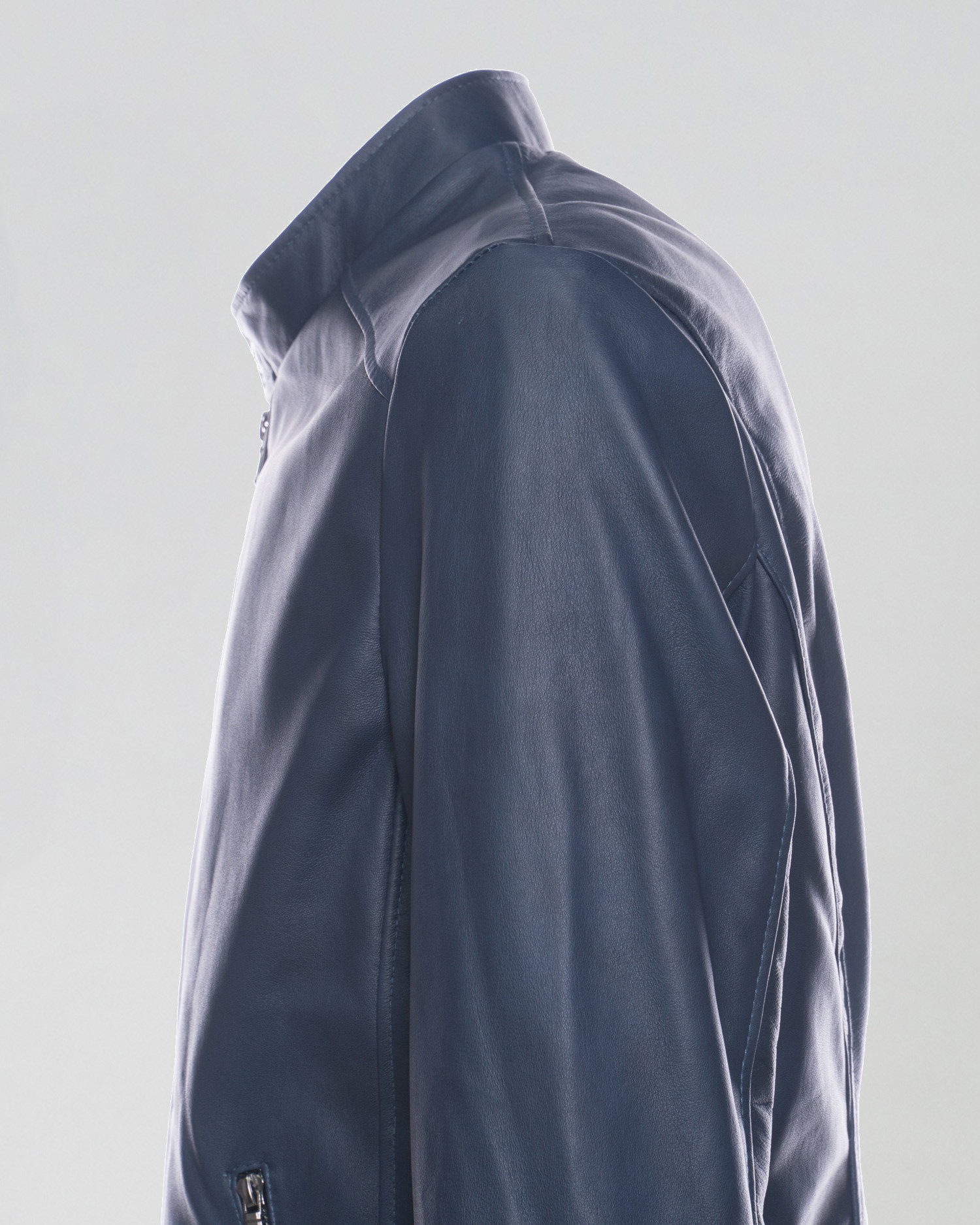 Giacca da uomo in pelle con struttura semi-rigida e cuciture rinforzate.