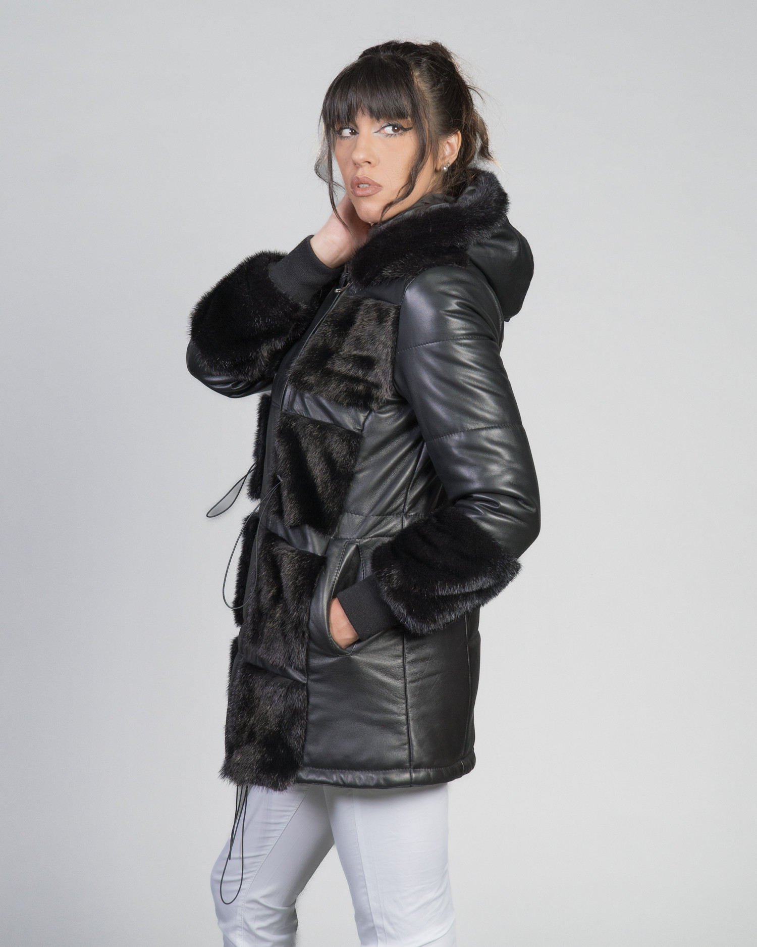 Giacca da donna realizzata con vera pelle e vera pelliccia di visone.