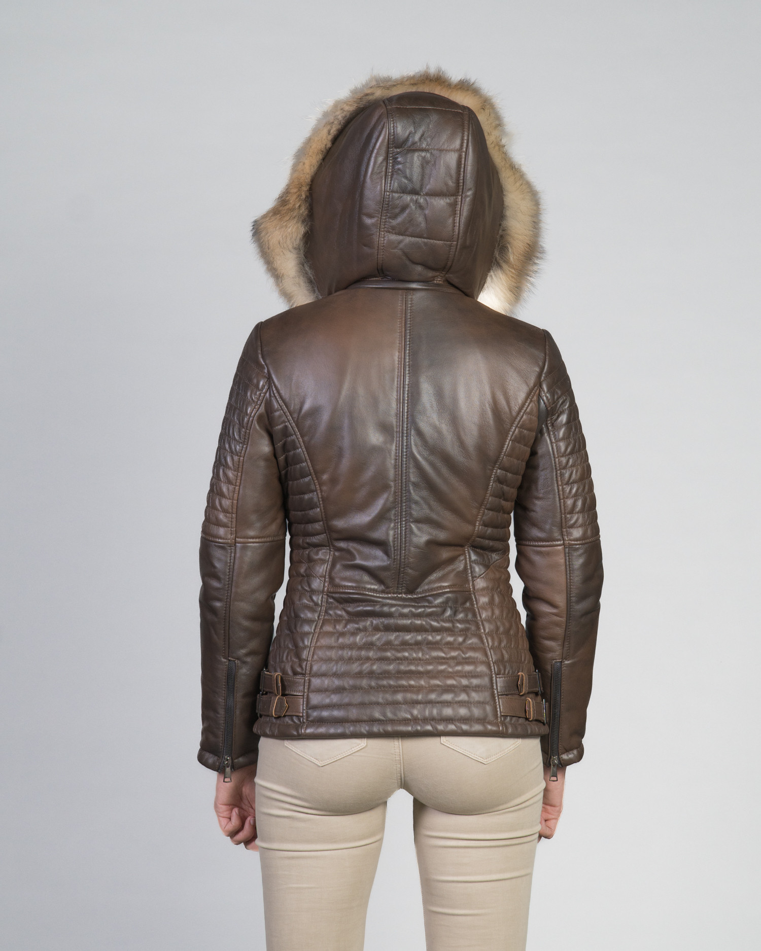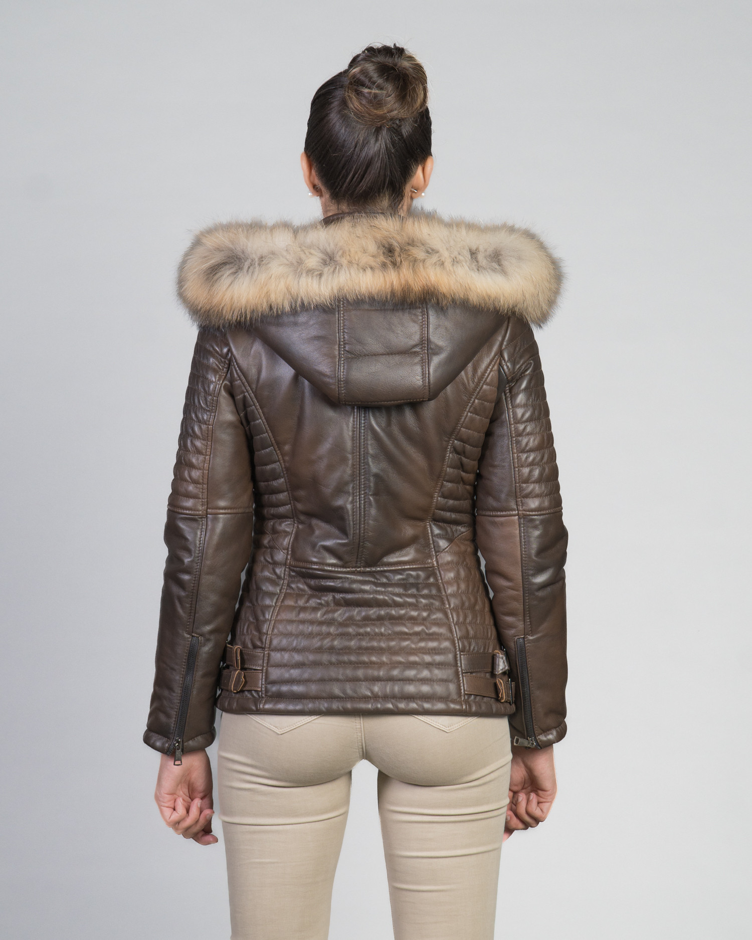 Piumino in pelle con cappuccio removibile dal bordo in pelliccia di volpe.