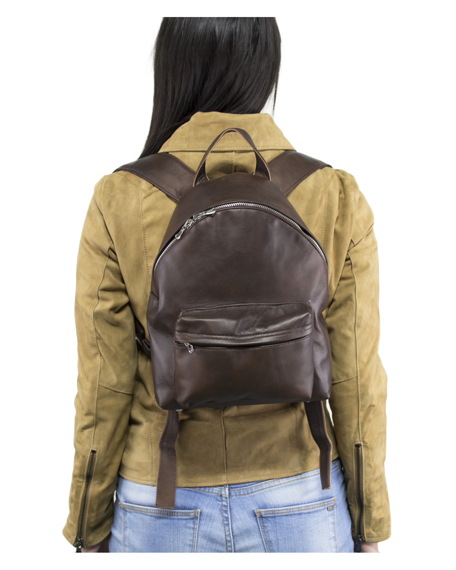 Zaino in pelle piccolo da donna con tascone frontale.