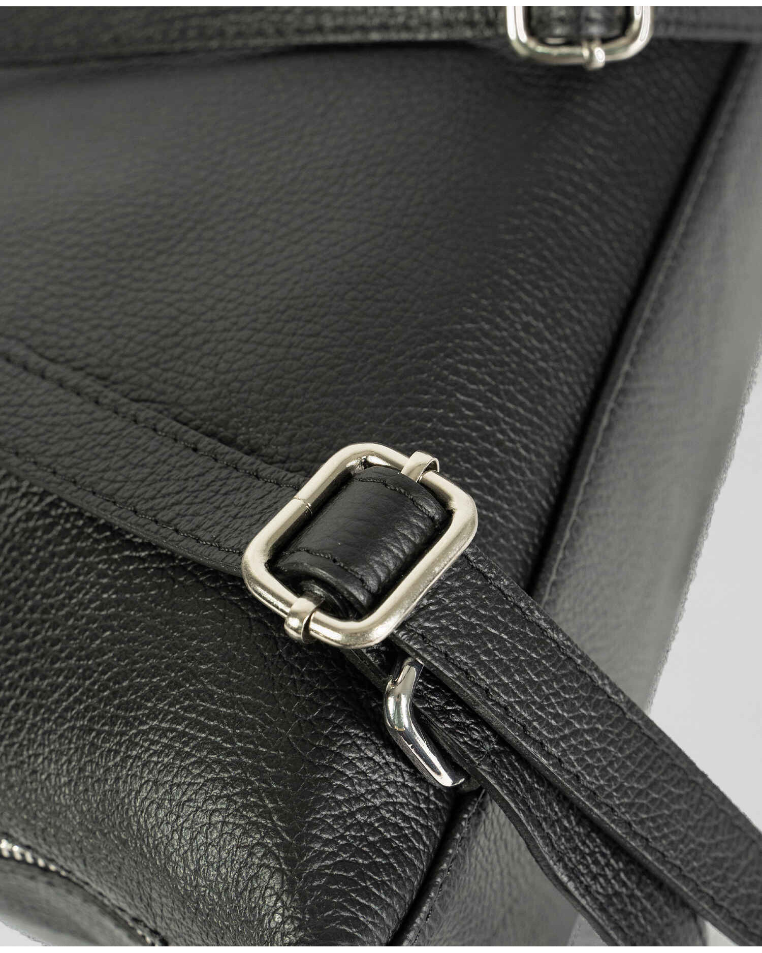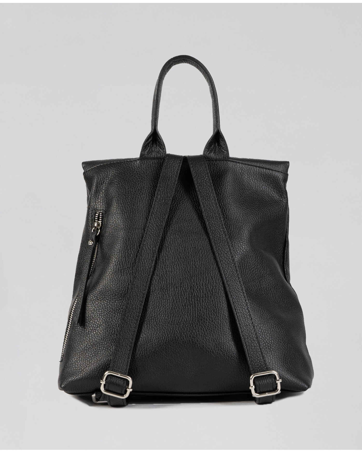 Zaino in vera pelle nera con chiusure zip e fodera interna.